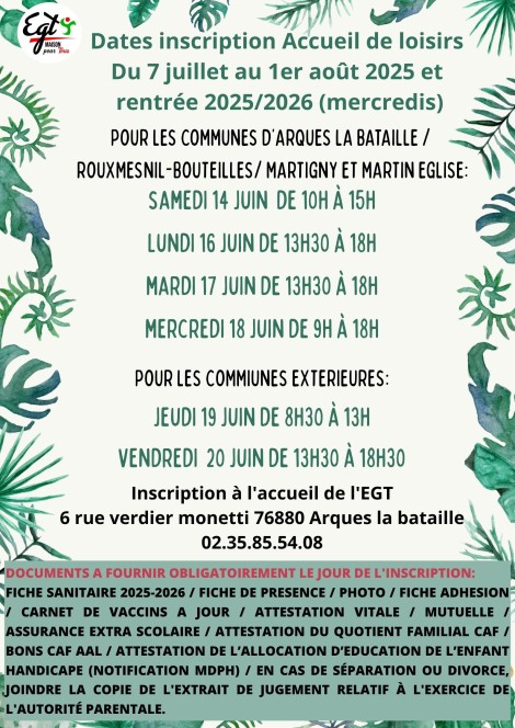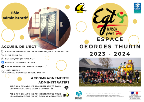retrouvez toute l’actualité du centre social de l’ EGT sur: espacegeorgesthurin.com .facebook.com/espacegeorgesthurin Téléphone : 02.35.85.54.08 Mail : egt.arques@gmail.com Accueil : 6 rue Verdier Monetti Arques la Bataille Au programme cette année : Gym Fitness : lundi 8 et/ou jeudi 11 septembre Gym douce : mardi 9 septembre Multimédia : mardi 9 septembre Cuisine : mardi 9 septembre Multi-sports (enfants de 6 à 10 ans) : mercredi 10 septembre Couture : mercredi …