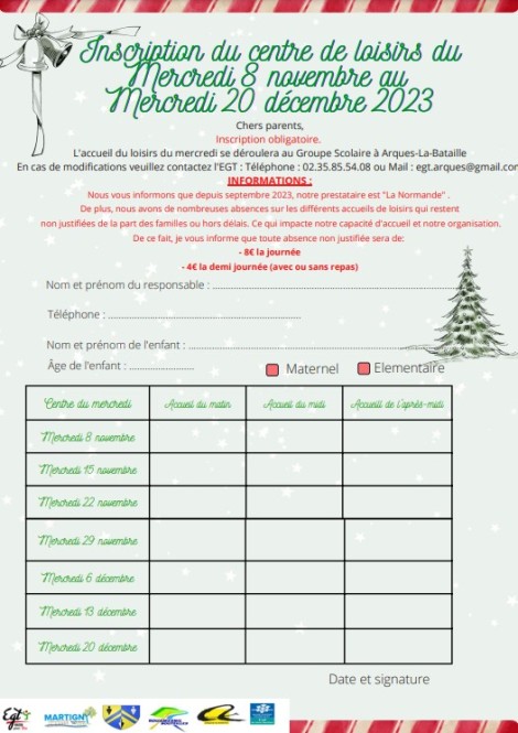 Inscription au centre du loisir du mercredi de novembre à décembre