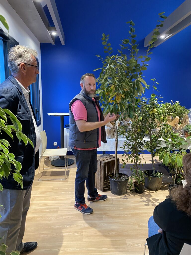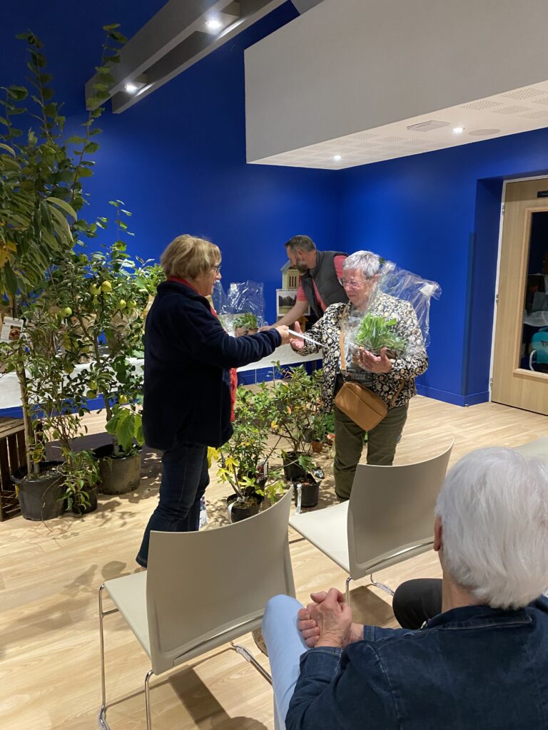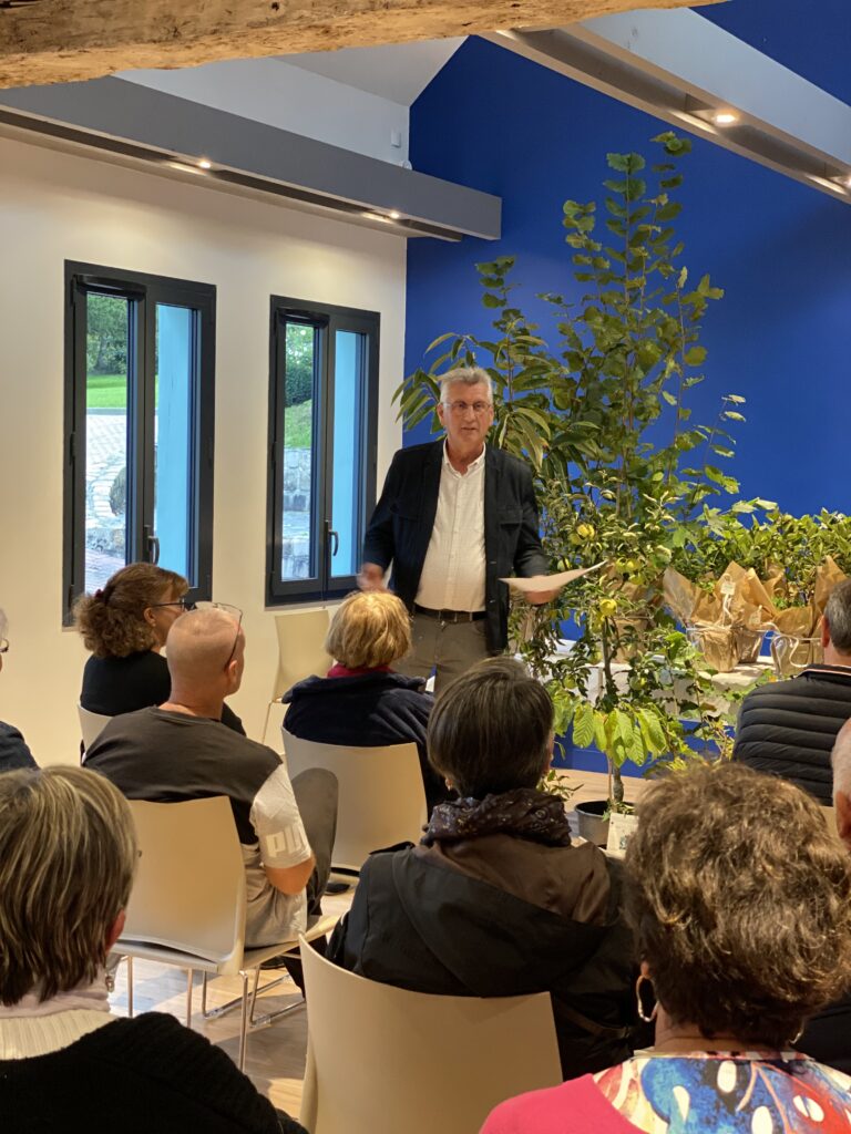 Le thème abordé lors de la cérémonie organisée le jeudi 12 octobre salle des Saulniers, par M. Olivier Bézuel « Des jardins d’Avremesnil », était la permaculture et la forêt comestible. Dans nos jardins, petits ou grands, il est possible de créer un espace boisé, composé de plusieurs strates d’arbres et de végétaux consommables. Comme par exemple un châtaignier (10 m avec une taille régulière), associé à un pommier demi-tige (4-6m), des arbustes à fruit comme des groseilliers, des baies de mai, des fuchsias à baie ou à coque telle que le noisetier, au pied desquels vous pourrez planter des fraisiers et une multitude de plantes aromatiques. Cet ensemble va créer au fils de leur croissance un terrain favorable à la permaculture, avec la décomposition des feuilles et des petits branchages, à cela s’ajoute de la tonte, du foin, de l’engrais verts, bref tout ce que vous avez sous la main. Cela fournira un bon équilibre et favorisera la biodiversité. Dans cette matière fertile, humide et ombragée, vous pourrez sans souci faire pousser vos légumes, radis, salades, pommes de terre, courgettes, etc….. Sans avoir initialement à labourer la terre.
