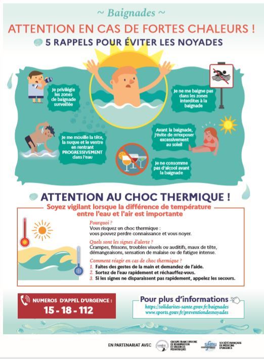 Avec l’arrivée des beaux jours et des premières chaleurs, les ministères chargés de la Santé et des Sports rappellent les conseils pratiques et comportements à adopter pour se baigner sans danger. En effet, les pics de noyades estivales sont davantage observés pendant les week-ends, particulièrement en période de vacances, et pendant les périodes de fortes chaleurs.