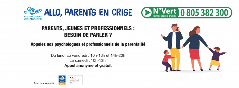 « Allo parents en crise » – 0 805 382 300, numéro vert de la Fédération nationale des Ecoles des parents et des éducateurs (Fnepe) et de son réseau, offre écoute, soutien et informations aux familles et aux professionnels sur toutes les problématiques liées à la vie familiale et à la parentalité.