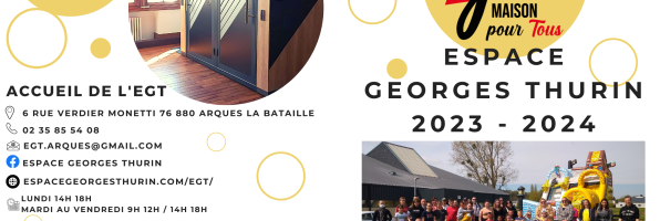 retrouvez toute l’actualité du centre social de l’ EGT sur: espacegeorgesthurin.com .facebook.com/espacegeorgesthurin Téléphone : 02.35.85.54.08 Mail : egt.arques@gmail.com Accueil : 6 rue Verdier Monetti Arques la Bataille Au programme cette année : Gym Fitness : lundi 8 et/ou jeudi 11 septembre Gym douce : mardi 9 septembre Multimédia : mardi 9 septembre Cuisine : mardi 9 …