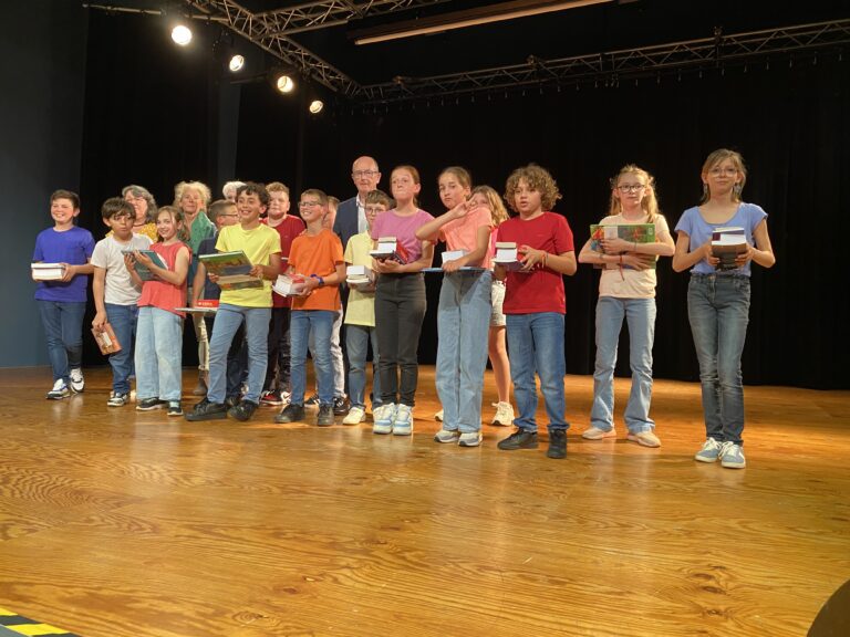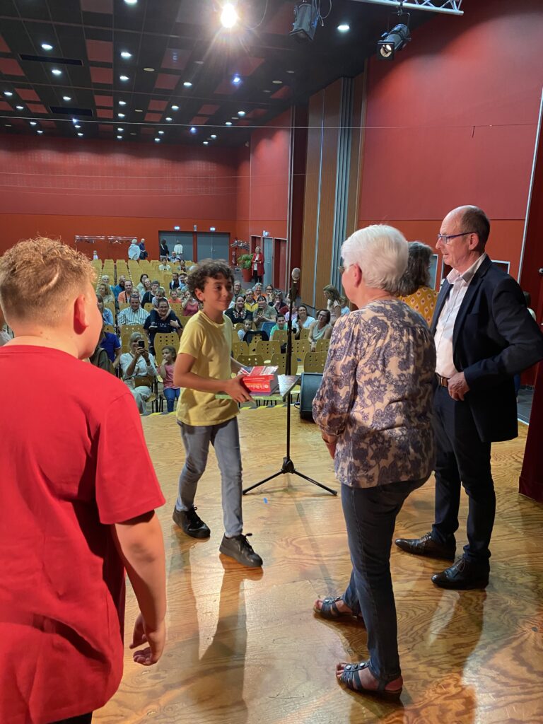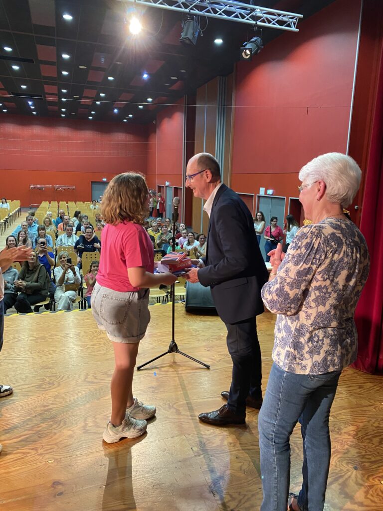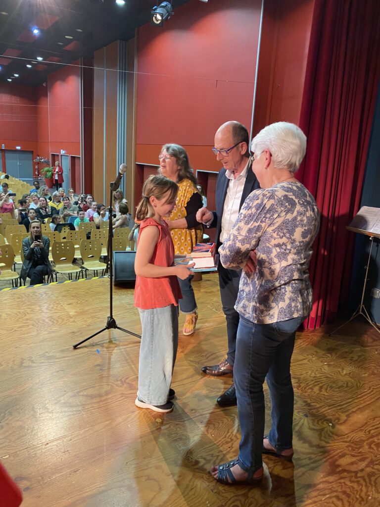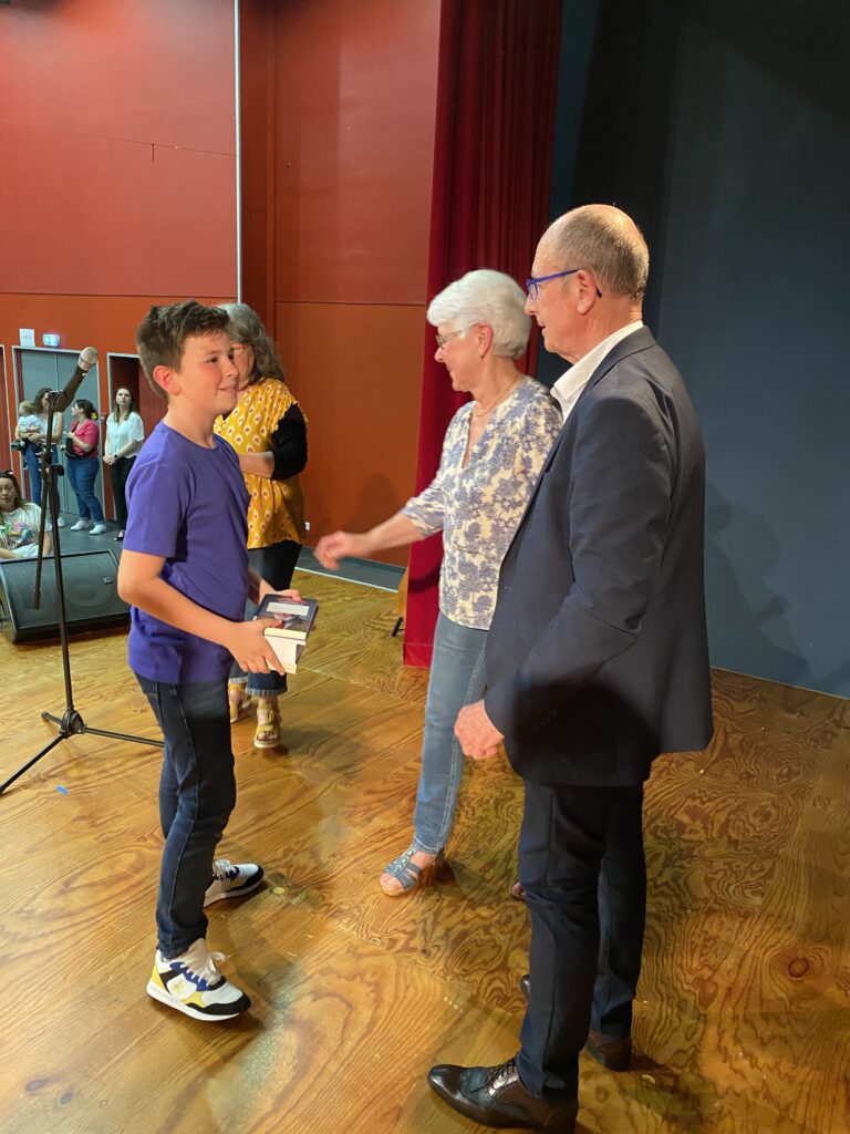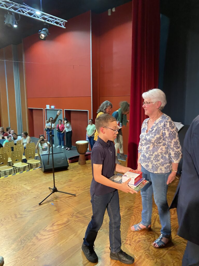 Ce fut alors l’occasion, pour Monsieur le Maire, Madame Artur, adjointe de la commission scolaire et Mme Hamon directrice, de procéder à la remise des prix. Chaque enfant a reçu un dictionnaire d’anglais, de très  beaux livres que chacun a choisis (livres offerts par la mairie et l’éducation nationale).