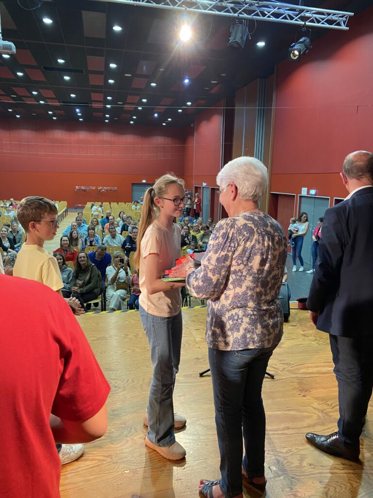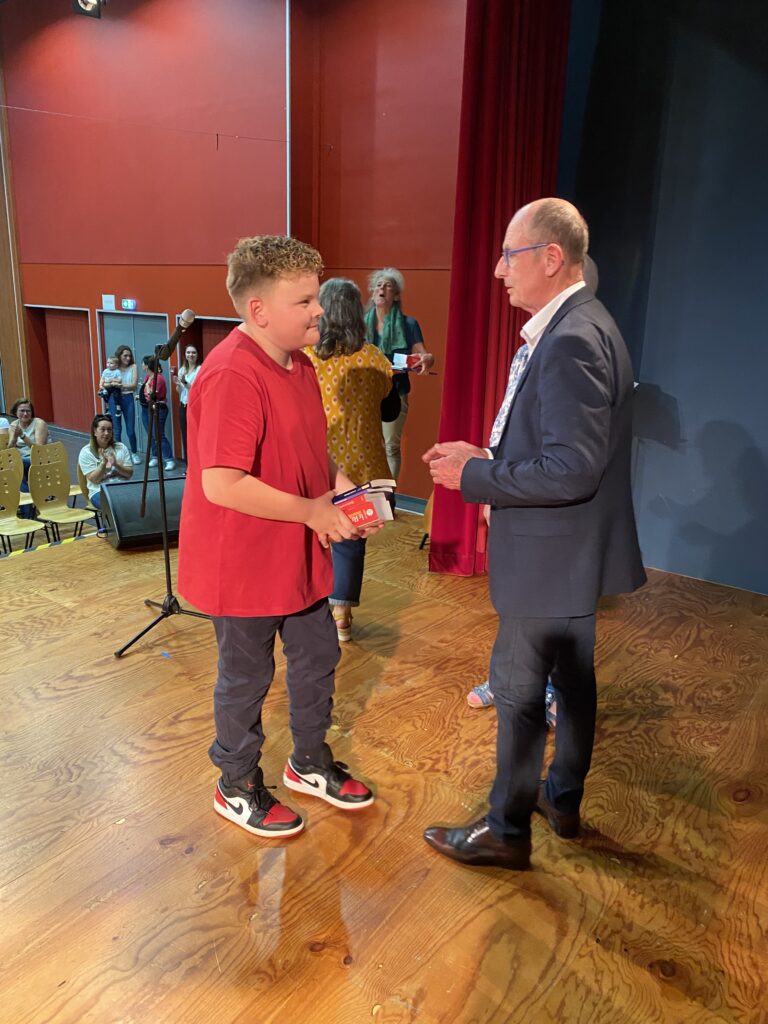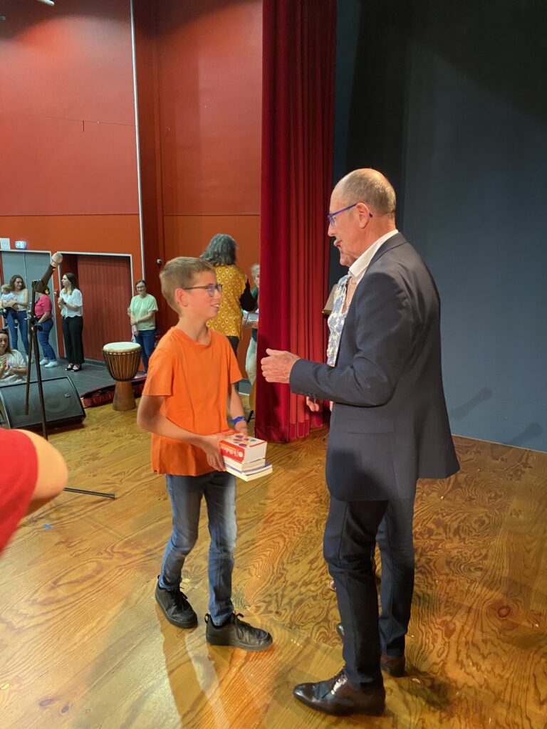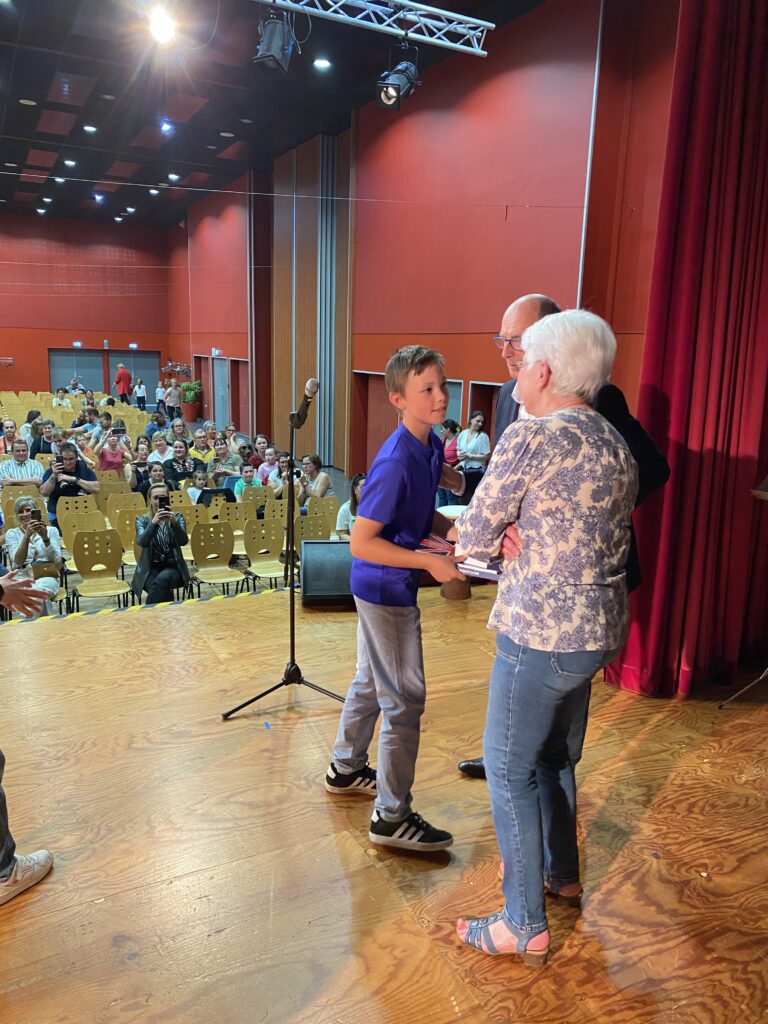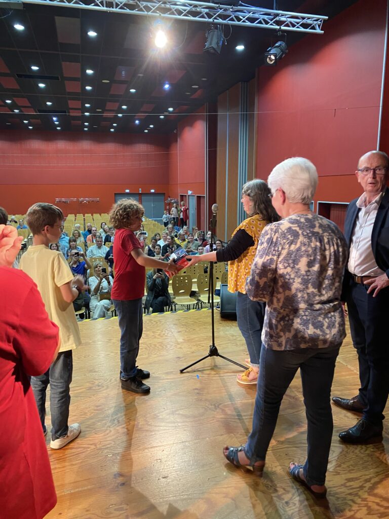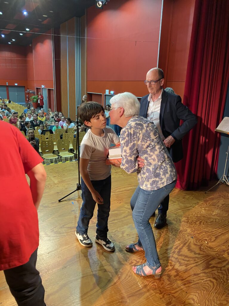 Ce fut alors l’occasion, pour Monsieur le Maire, Madame Artur, adjointe de la commission scolaire et Mme Hamon directrice, de procéder à la remise des prix. Chaque enfant a reçu un dictionnaire d’anglais, de très  beaux livres que chacun a choisis (livres offerts par la mairie et l’éducation nationale).