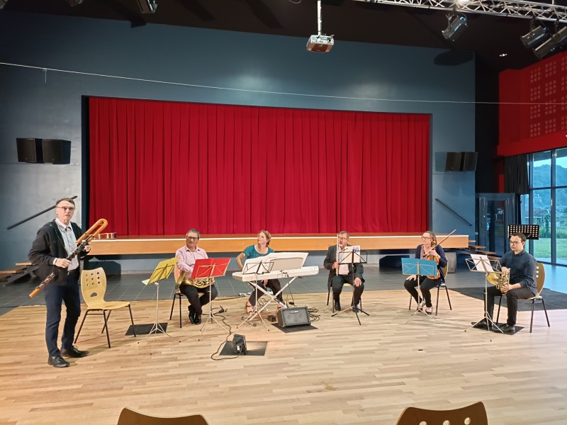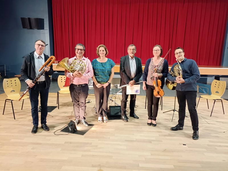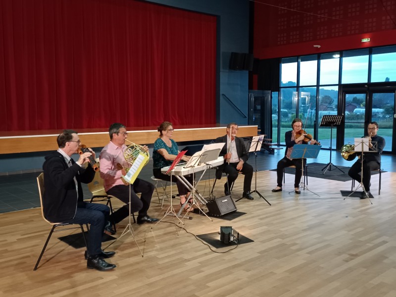 Seule une vingtaine de spectateurs ont assisté à la représentation donnée par l’Ensemble Cuivres ‘N Caux composé de : Claire Imbrosciano, violon – Christian Fest, François Louage, flûtes – Cyrille Imbrosciano et Victor Pavie, cors – Lynda Martin, piano.