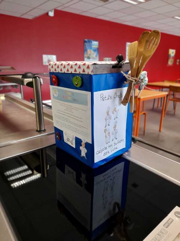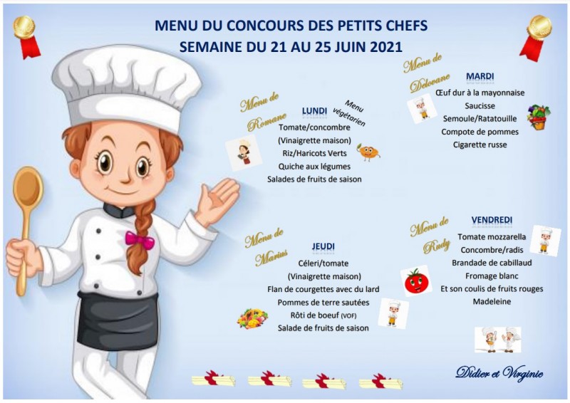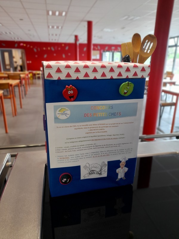 Pour concrétiser cette démarche et qu’elle n’ait pas été réalisée en vain, les membres de la commission scolaire, à l’initiative de Marie-Laure Delahaye, ont souhaité intéresser les enfants en les incitant à être acteurs de la composition de leurs menus. À cet effet, nous avons mis en place le « Concours des petits chefs/cheffes. Sans une collaboration fructueuse entre Mme Leteissier, les membres de la commission représentés par Mme Artur adjointe et des cuisiniers (Didier et Virginie), rien n’aurait été possible.
