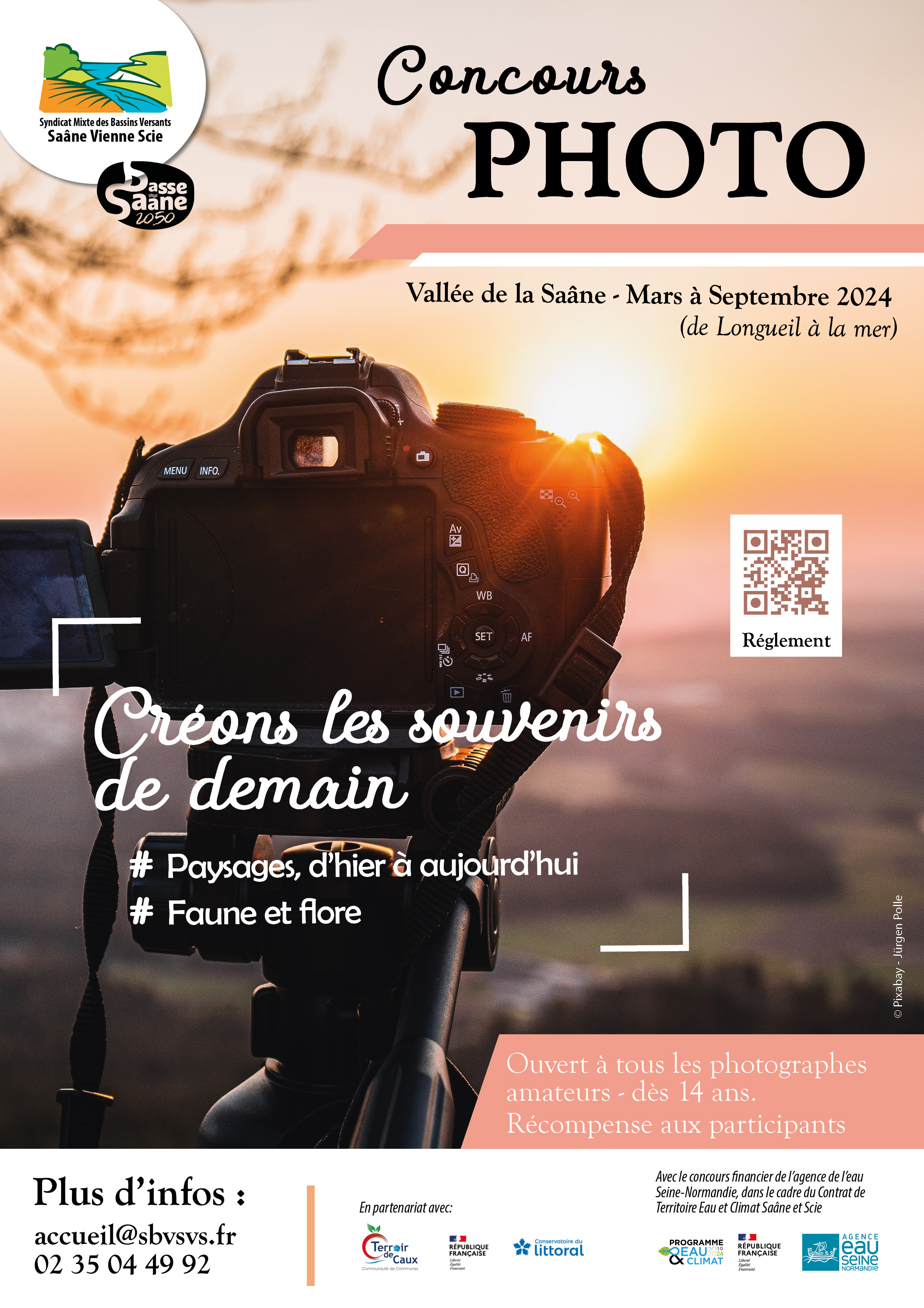 De mars à septembre 2024, le SMBV Saâne Vienne Scie, en partenariat avec l’agence de l’eau Seine-Normandie et l’office de tourisme Terroir de Caux, organise un concours photo sur la thématique « Créons les souvenirs de demain ».Deux catégories sont proposées : Paysages, d’hier à aujourd’hui Faune/Flore de la Vallée.