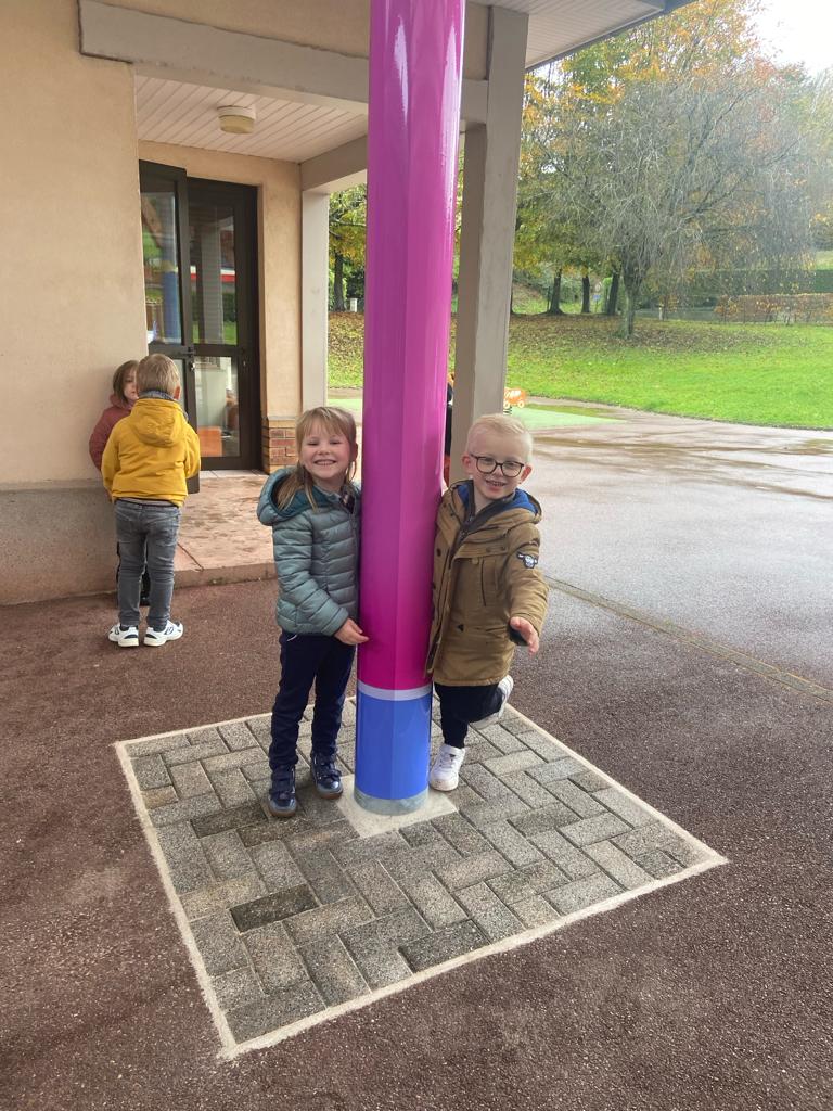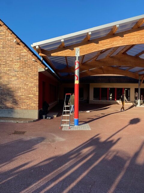 Pour embellir cette structure dont les supports en acier galvanisé étaient peu chaleureux, Marie-Laure Delahaye adjointe et membre de la commission scolaire, a soumis l’idée de les matérialiser par des stickers géants en forme de crayons de couleur.