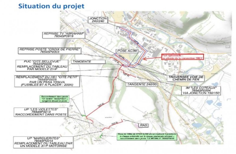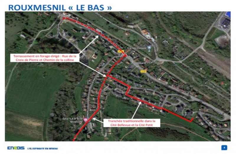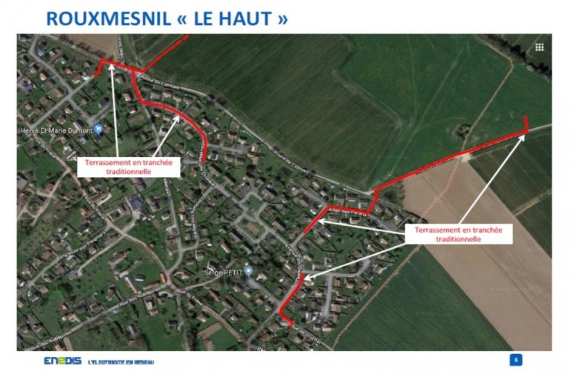 La deuxième phase, partant du poste de Dieppe, au carrefour du « Ch’timi », ne comporte pas d’urgence majeure et doit faire l’objet d’une autorisation de la SNCF pour passer sous la voie de chemin de fer. La société CEGELEC, mandatée par ENEDIS pour la réalisation du chantier (essentiellement par forages dirigés et tranchées traditionnelles), assure prendre en compte les nuisances que ces travaux vont occasionner aux riverains et mettra tout en œuvre pour en réduire les effets. Soyez assurés que la commune suivra ce dossier avec attention, pour le confort de ses administrés.