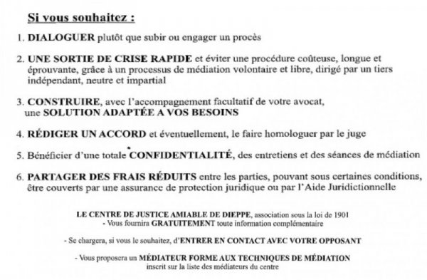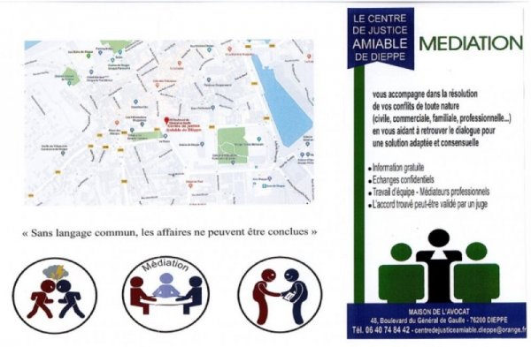Pour tous renseignements sur la médiation et le Centre de Justice Amiable de DIEPPE, contactez la Maison de l’Avocat: 02.35.04.95.26