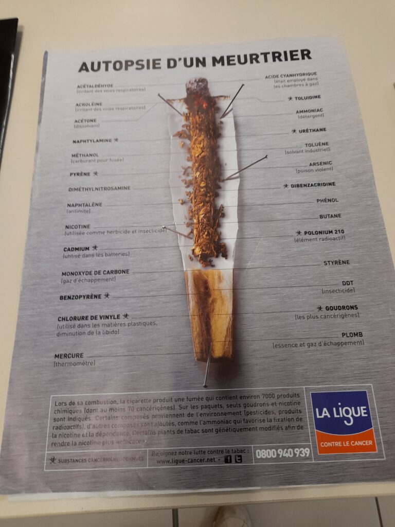 Dans la fabrication d’une cigarette il n’y a pas moins de 7000 produits nocifs :  en quantité élevée la nicotine, puis du cadmium, du polonium (élément radioactif), de l’acétone, du carburant de fusée, du goudron, du monoxyde de carbone, du mercure, de l’arsenic, du plomb, etc…Nous ne pouvons pas tous les citer.