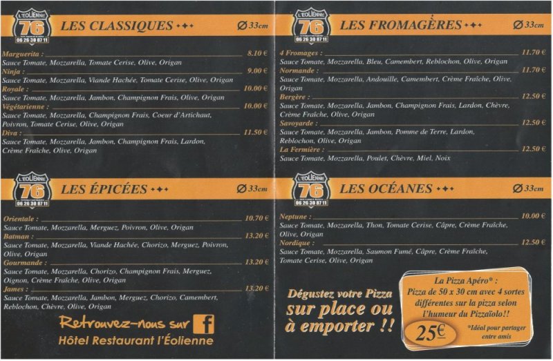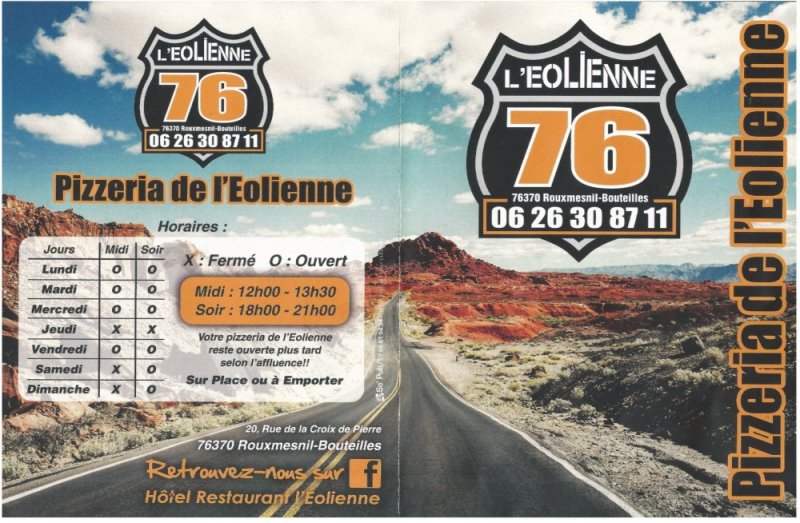Depuis quelques semaines, il souffle un vent de modernité sur l’établissement tenue par Delphine et Sébastien DUBOST. Une transformation résolument tendance, à la décoration subtilement choisie, ambiance bar à vins, bières et champagnes, mais toujours avec modération ! Pour des soirées entre amis, à thèmes ou privées, pour déguster de généreuses planches de charcuteries, Tapas et la « Pizza Apéro ». Car l’Éolienne 76, c’est aussi votre nouvelle pizzeria, sur place ou à emporter (06.26.30.87.11), classiques, épicées, fromagères ou océanes. Retrouvez toute l’actualité de « l’Éolienne 76 » sur Facebook : l’éolienne restaurant rouxmesnil-bouteilles et sur YouTube : hôtel restaurant l’éolienne