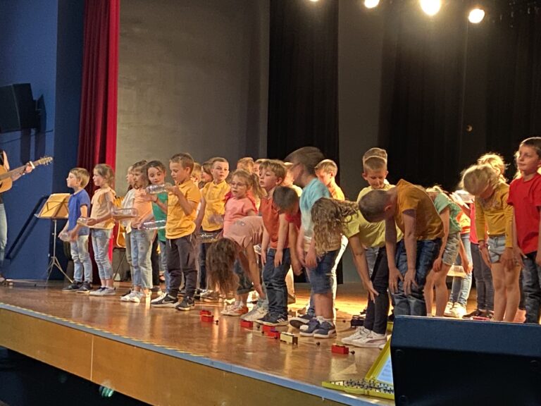 Avec Claire à la guitare, Sylvain et Yannick à la sonorisation, les enfants nous ont emmenés dans un tourbillon de chansons diverses, accompagnées de petites danses, de gestuels, en rapport avec le thème. Nous avons pu admirer les enseignantes de maternelle danser pour accompagner leurs petits élèves dans « une danse des canards » endiablée, puis Madame Grenet s’atteler aux percussions et tout cela dans une ambiance fort agréable.