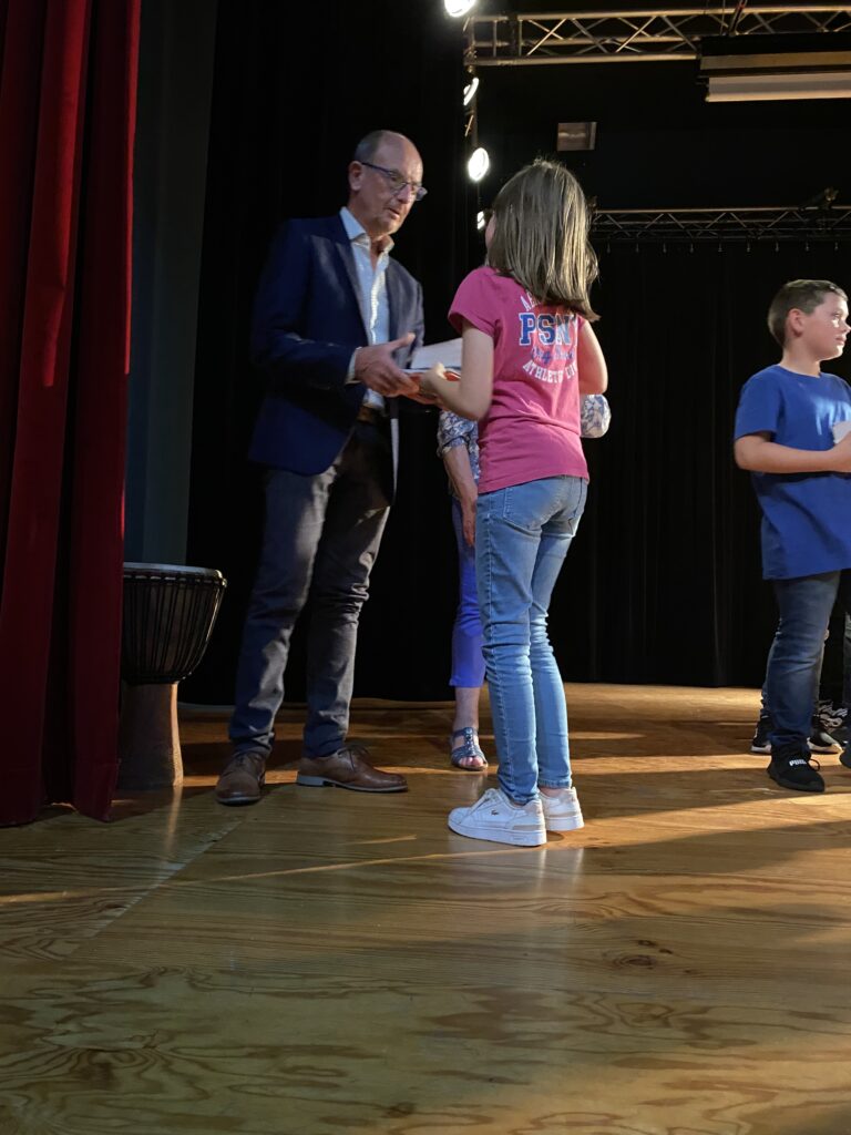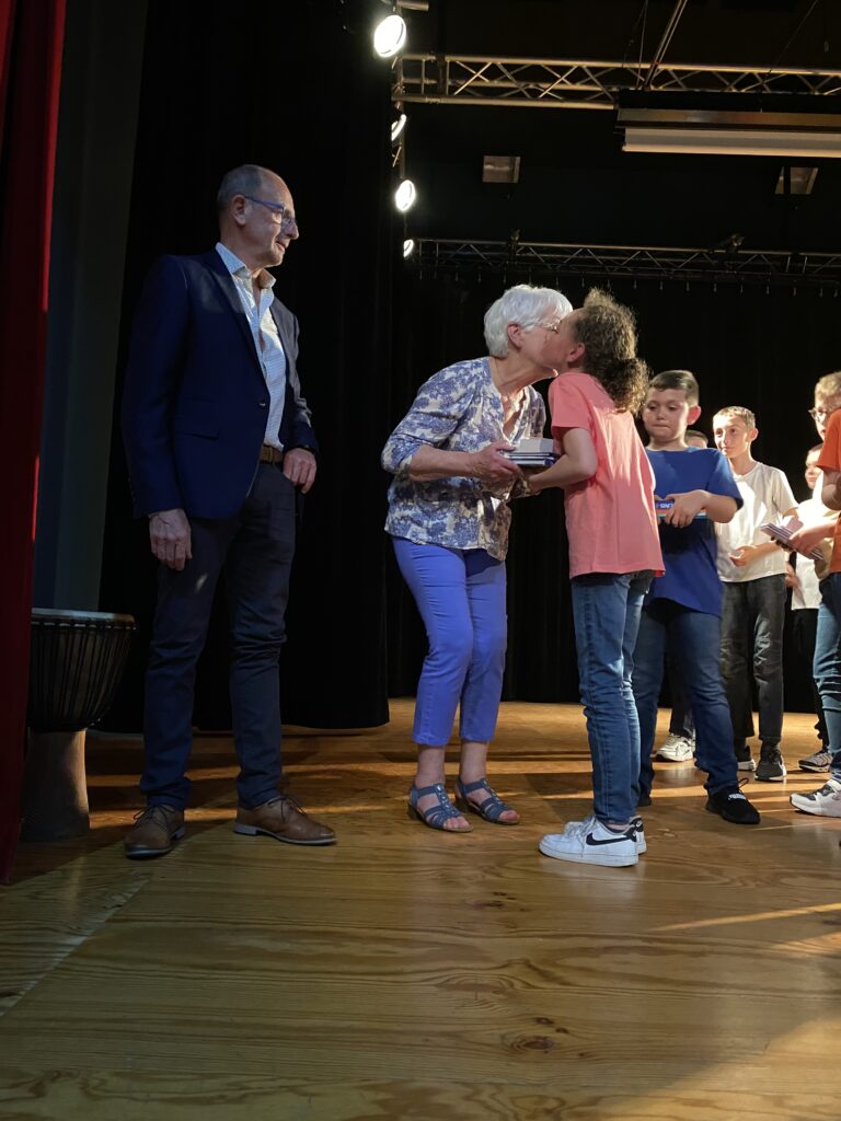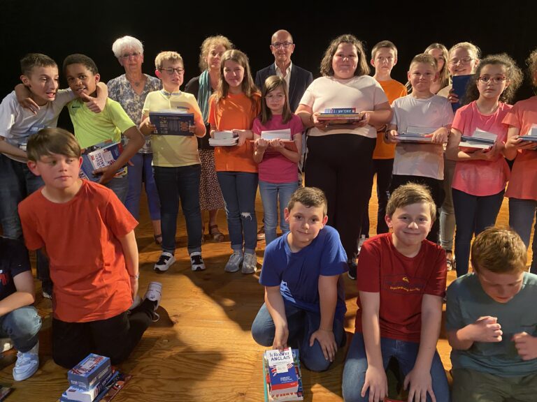 Ce fut alors l’occasion, pour Monsieur le Maire et Madame Artur, adjointe de la commission scolaire, de procéder à la remise des prix. Chaque enfant a reçu un dictionnaire d’anglais, de très beaux livres que chacun a choisis (livres offerts par la mairie et l’éducation nationale), ainsi que le livret « A la découverte de ta commune » pour l’aider à comprendre le fonctionnement d’une municipalité.
