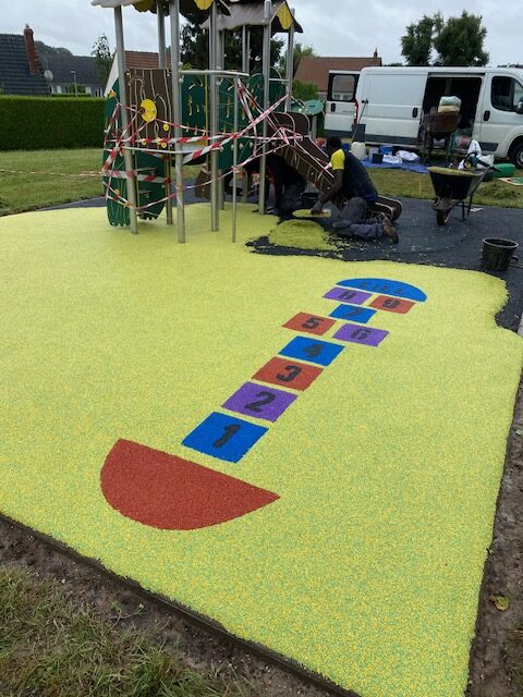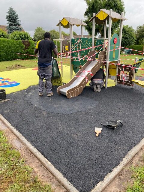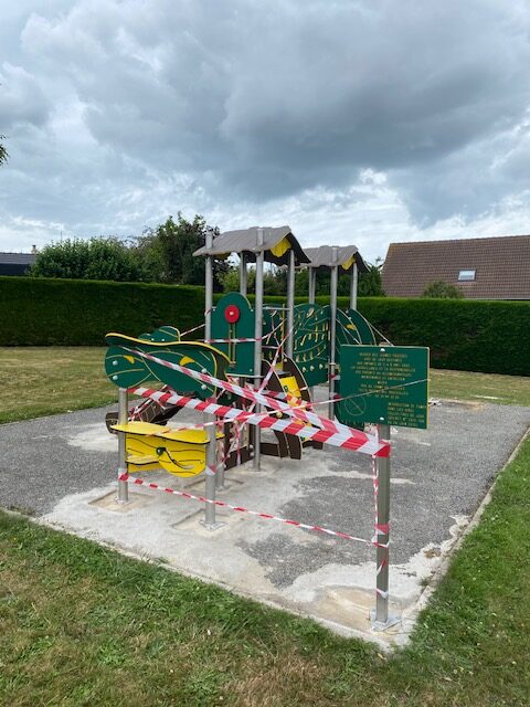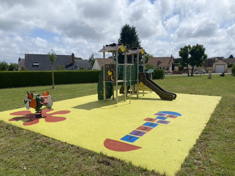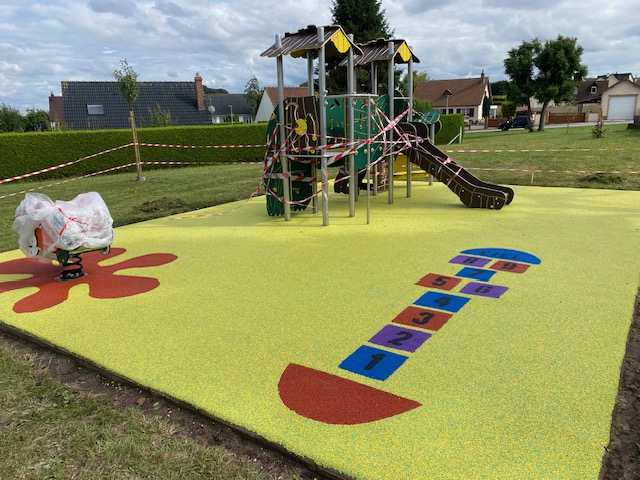 Aujourd’hui, les travaux de montage de l’ensemble, jeux et sol souple sont achevés et certifiés.  Il est prévu également, une sente piétonne, des places de stationnements adaptés aux familles et aux personnes à mobilité réduite. Ces travaux sont programmés fin septembre et seront réalisés par l’entreprise EUROVIA. Dans la continuité, des bancs, des poubelles et des panneaux directionnels seront installés.