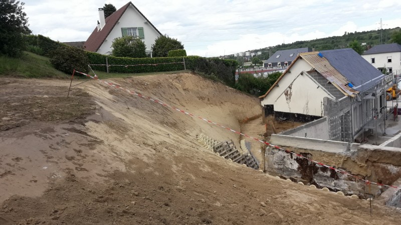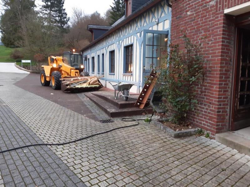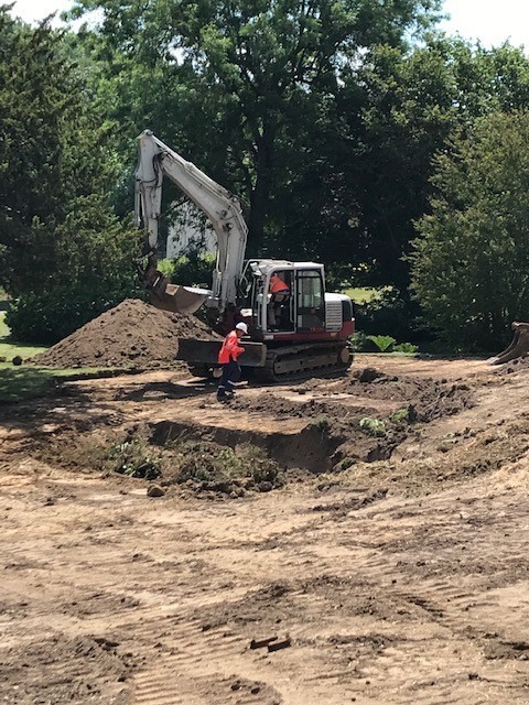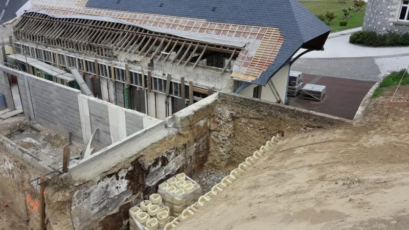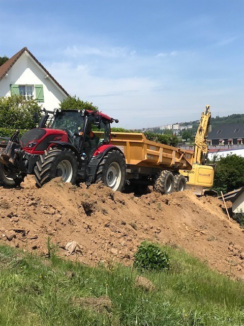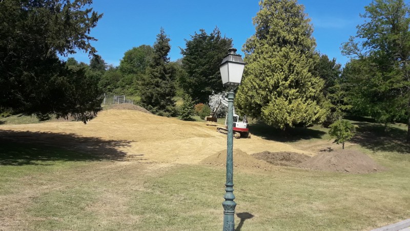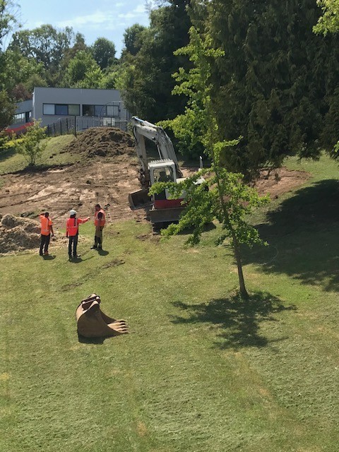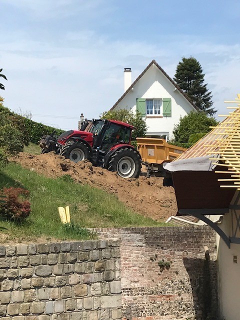 Depuis quelques jours des pelleteuses et des tracteurs s’affairent dans le parc du Prieuré. La réhabilitation de l’ancienne cantine a mis en lumière d’importantes infiltrations d’eau de pluie dans les fondations à l’arrière du bâtiment au niveau de l’ancienne cuisine. C’est un chantier impressionnant de mouvement de terre de près 1000 m3. Cette terre végétale de bonne qualité sera utilisée pour redessiner le parc à l’arrière de la mairie de manière à casser la pente abrupte, afin d’en faciliter l’accès lors de l’entretien paysager par les employés communaux.