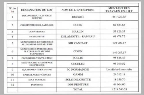 Dans le garage, nous accueillerons un fleuriste et dans les locaux annexes sont prévus, 3 infirmières, une esthéticienne, et un ostéopathe. Ce projet a été confié au cabinet Curtet – Chalverat de Dieppe. Montant du marché 1 214 540.28 € H.T tel qu’indiqué dans le tableau ci-dessus.