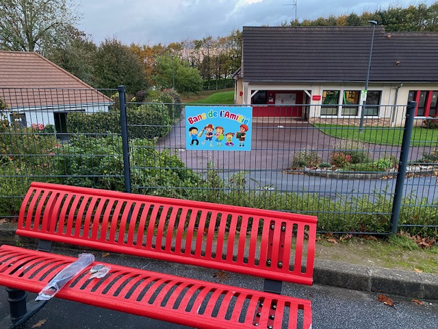 Puis dans la cour de l’école, un banc est dédié depuis l’an passé à « l’Amitié ». Chaque enfant dans la peine peut s’asseoir un moment et les adultes ou les camarades peuvent le rejoindre pour parler et le consoler. L’affiche réalisée par une AESH, a subi également les outrages du temps. Celle-ci méritait d’être pérennisée par un support plus durable et illustrée de personnages souriants. Ces deux pancartes ont été réalisées et posées par EPH, entreprise de la ZI de Rouxmesnil-Bouteilles.