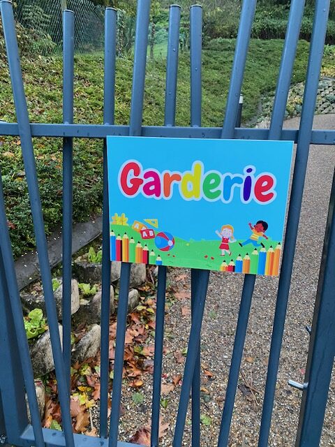L’ancienne pancarte plastifiée indiquant la garderie n’a pas résisté aux intempéries, nous l’avons remplacée par un matériau plus approprié et un graphisme très coloré, rappelant ce lieu dédié aux enfants.