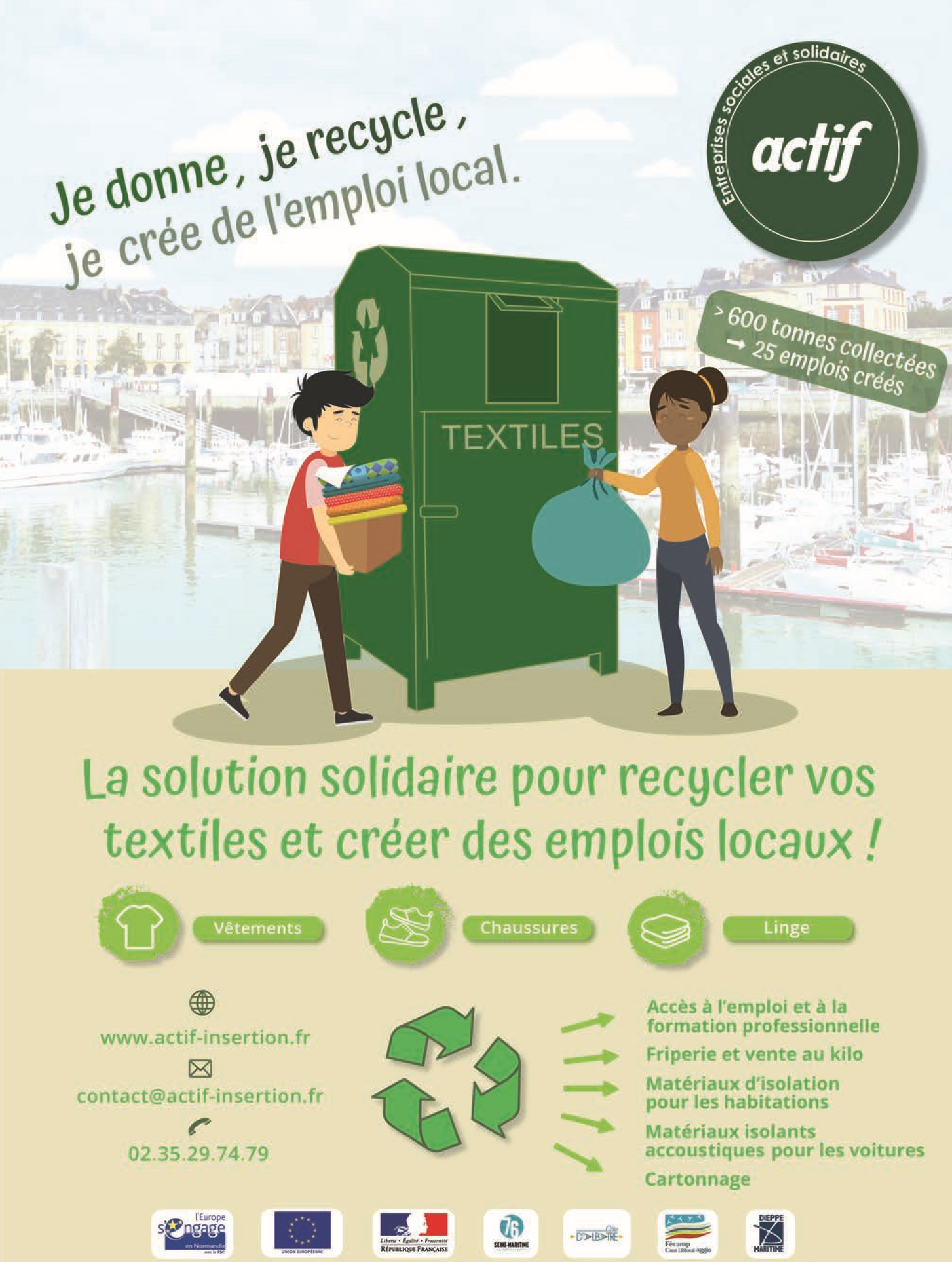 Dieppe-Maritime a conventionné avec Actif Insertion pour l’implantation de 36 bornes de collecte sur l’ensemble du territoire. Pour assurer la collecte, Actif Insertion a créé un chantier d’insertion. Ce dernier, situé avenue de la Libération à Neuville-lès-Dieppe, est ouvert depuis décembre 2021. Il emploie actuellement 10 personnes dont 8 en contrat d’insertion.