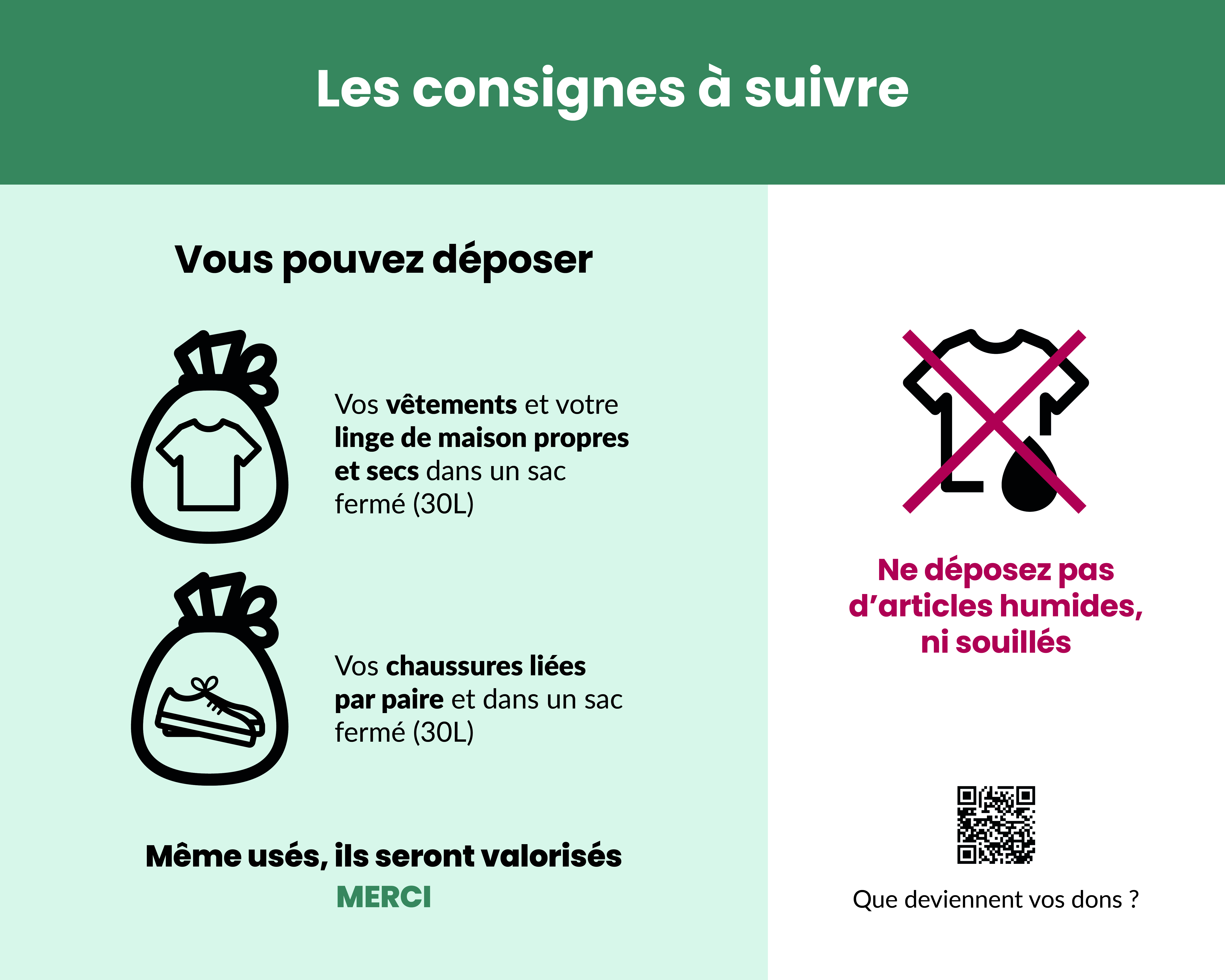Pour que les vêtements puissent être valorisés il est nécessaire de ne rien déposer au pied de la borne. En effet, tous les articles humides risques de faire moisir l’ensemble de la collecte et de rendre tous les produits inutilisables.
