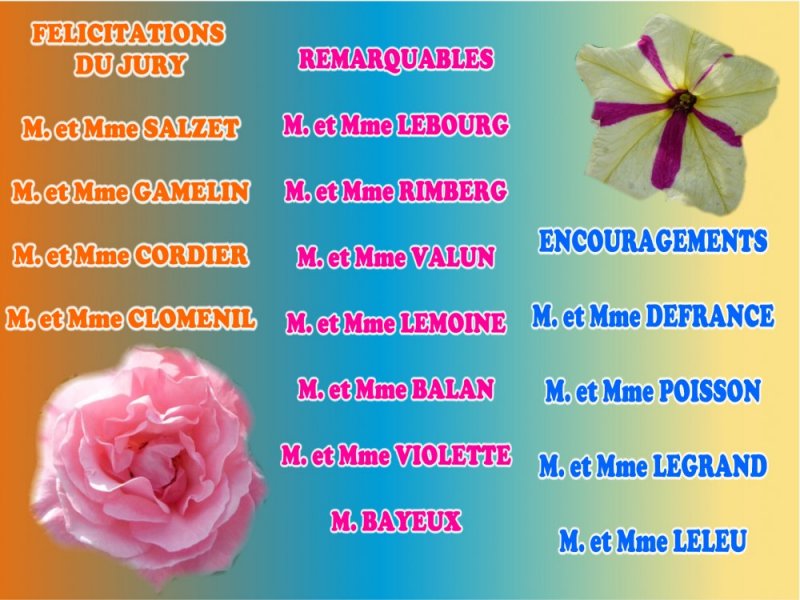 M et Mme SALZET, ainsi que Mr et Mme SACEPE seront reçus prochainement à l’hôtel du département de Rouen, pour la remise des prix dans la catégorie « Excellence », tous deux recevront un « chèque en bois », à utiliser chez un horticulteur de la région.