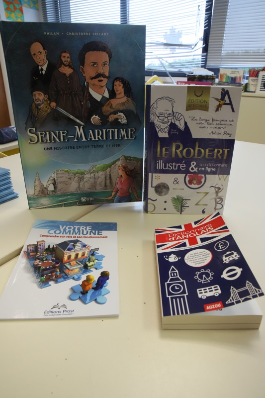 Du fait de la Covid, de nombreuses activités extérieures n’ont pu être réalisées cette année. Pour compenser ce manque, sur proposition de la commission scolaire, la mairie a décidé de faire un geste supplémentaire et d’attribuer à chacun en plus des deux dictionnaires, un livre sur la Seine Maritime, qui retrace l’évolution de notre beau département, de la préhistoire à nos jours. Est joint à cette « BD », le petit livret « Votre commune » qui explique son rôle et son fonctionnement.