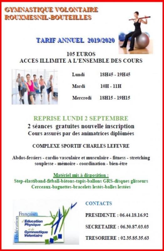 Tarif inchangé, 105€ pour un accès illimité à l’ensemble des cours, reprise des cours le lundi 2 Septembre 2019, le certificat médical est toujours obligatoire. venez nous rejoindre !! Plus de renseignements auprès de la Présidente, Christine Petiteville 06 44 18 16 92