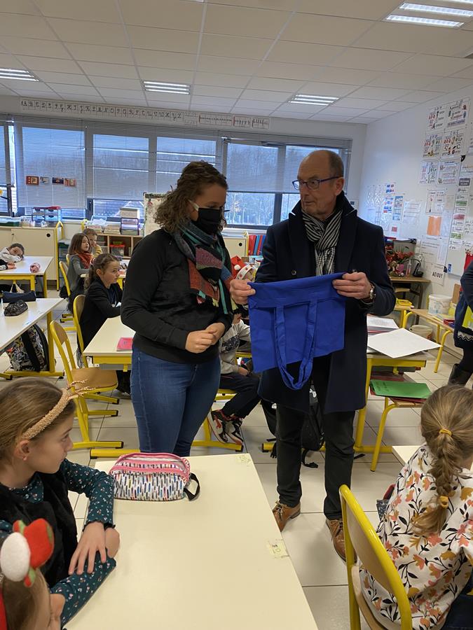 Cependant ce n’était pas le seul but de son étape à Rouxmesnil -Bouteilles, puisque l’après-midi, il avait la lourde charge de distribuer aux enfants les cadeaux qu’il avait apportés dans sa hotte. C’est accompagné de Monsieur GROUT et de représentants de la commission scolaire qu’il a remis des livres aux élèves de GS/CP et CE1 et des chèques cadeaux d’une valeur de 12€ aux jeunes de CE2/CM1 et CM1/CM2, le tout accompagné de chocolats.