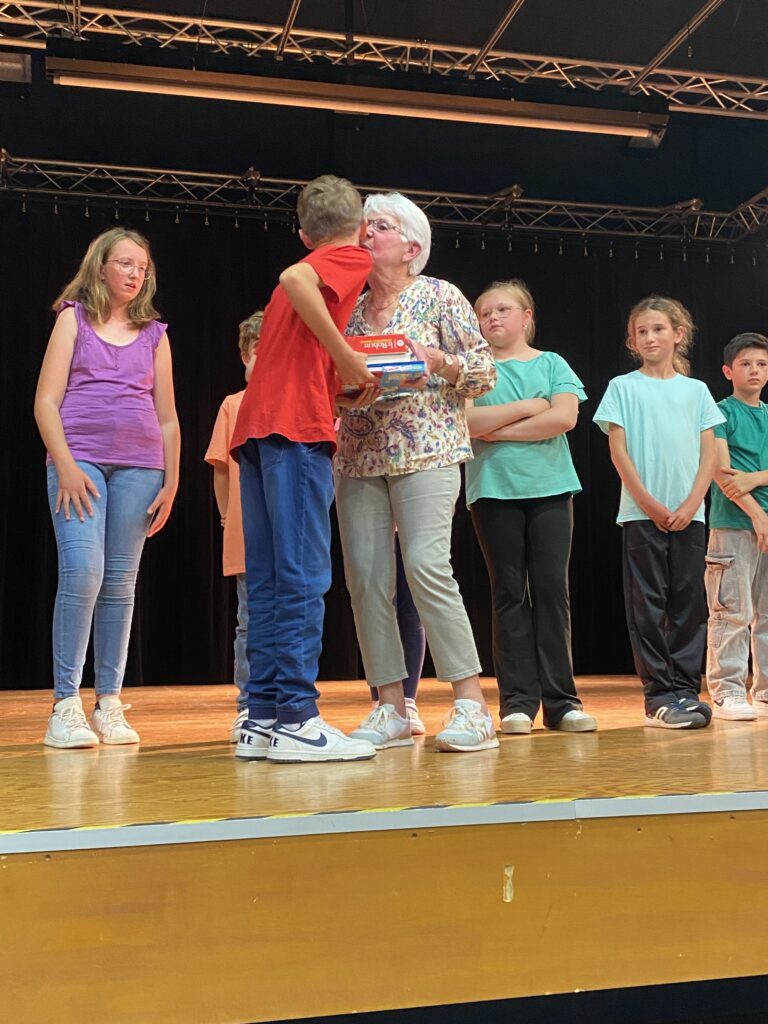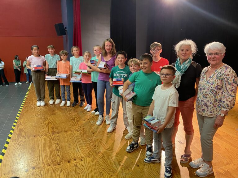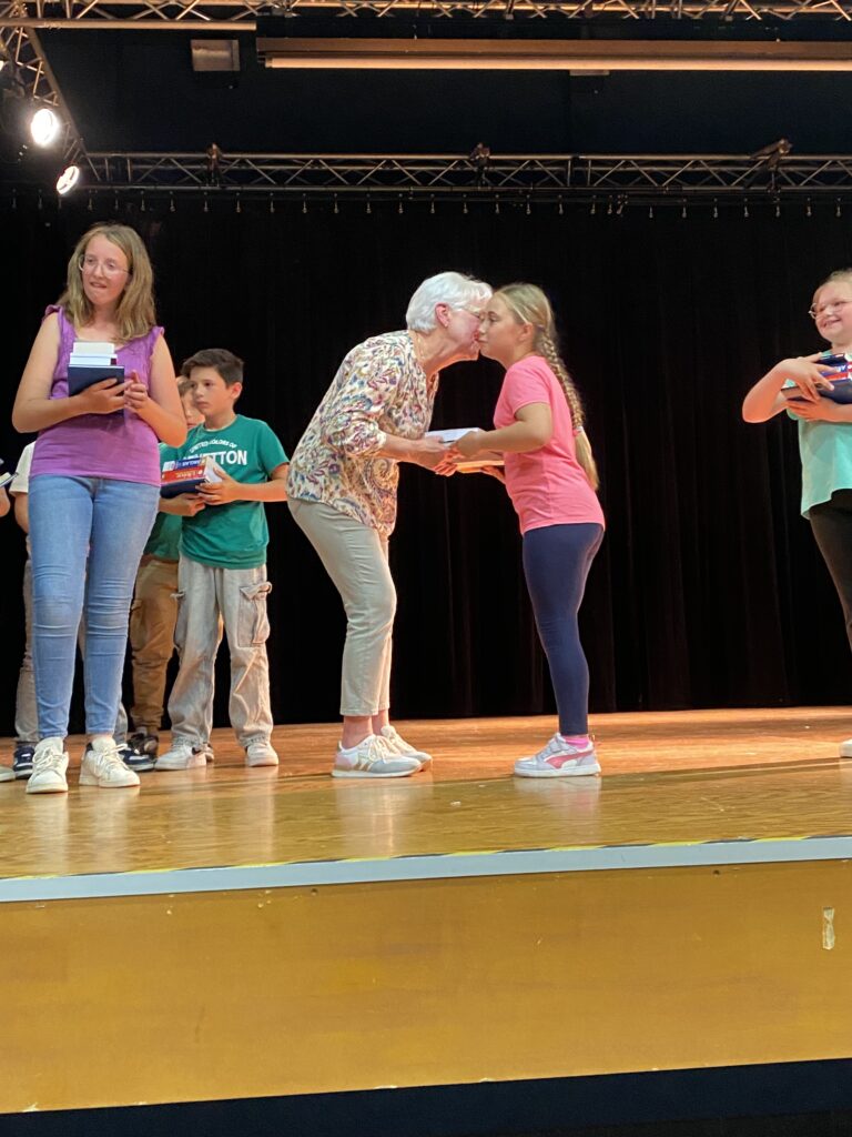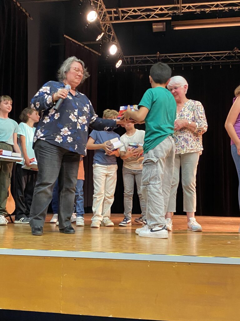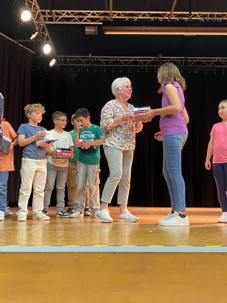 En l’absence de Monsieur le Maire, excusé, c’est Mme Artur, adjointe de la commission scolaire et Mme Hamon directrice, qui ont procédé à la remise des prix. Chaque enfant a reçu un dictionnaire d’anglais, de très beaux livres que chacun a choisis (livres offerts par la mairie et l’éducation nationale).