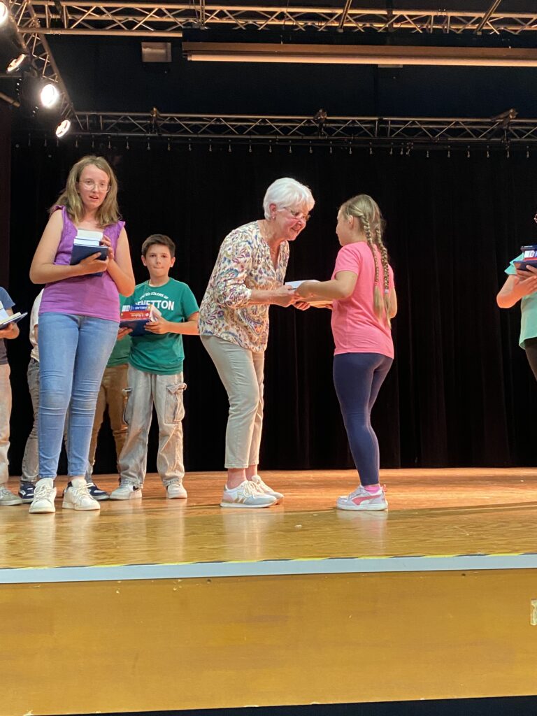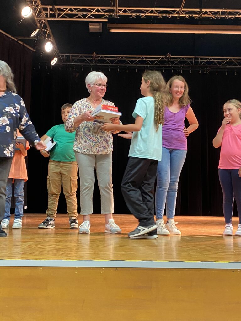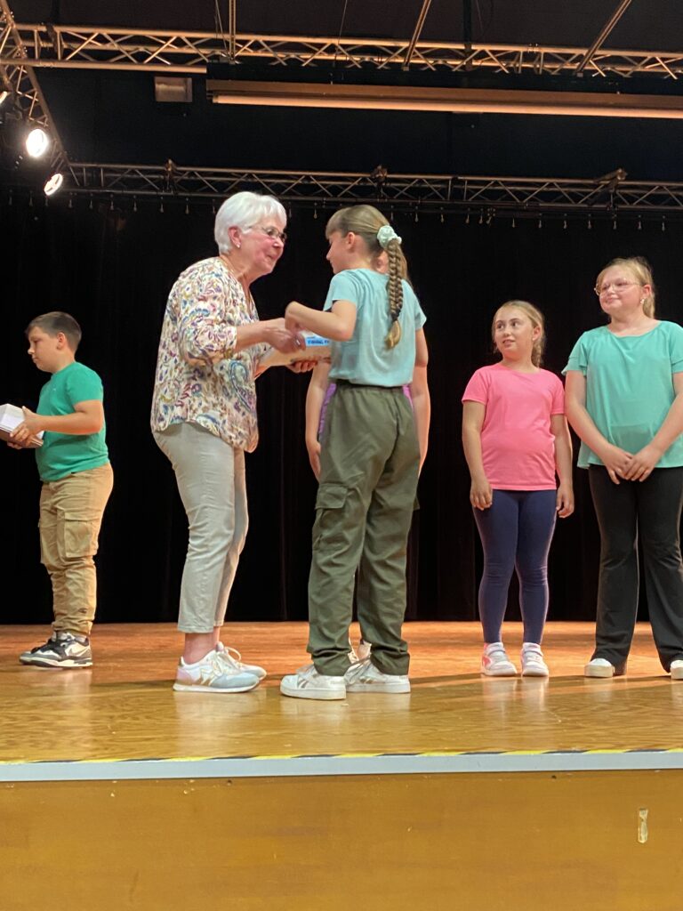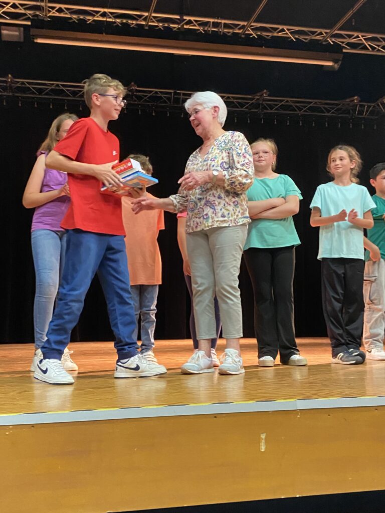 En l’absence de Monsieur le Maire, excusé, c’est Mme Artur, adjointe de la commission scolaire et Mme Hamon directrice, qui ont procédé à la remise des prix. Chaque enfant a reçu un dictionnaire d’anglais, de très beaux livres que chacun a choisis (livres offerts par la mairie et l’éducation nationale).