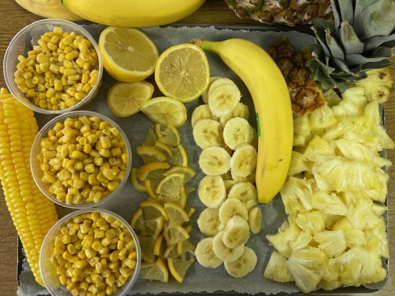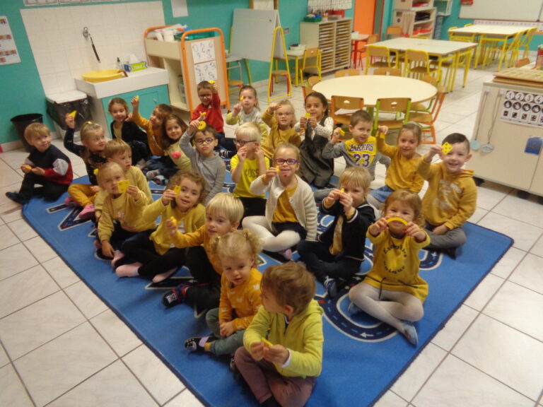 Jeudi était consacré à la couleur jaune. Nous avons pu « déguster » des grains de maïs, des rondelles de citron, des bananes et des ananas. L’acidité du citron a déclenché quelques grimaces mais certains ont semblé apprécier.