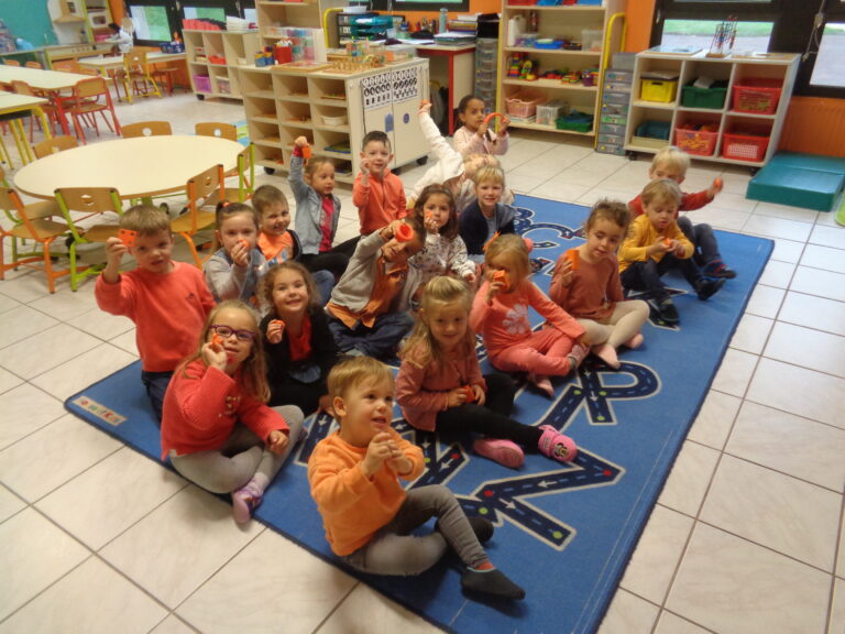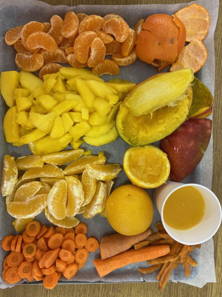 Mardi nous avons eu plus de mal à trouver des aliments oranges (à part les oranges bien sûr!). Les maîtresses nous ont proposé de goûter des carottes, des oranges, des clémentines et des mangues. Ces fruits tropicaux, moins connus, ont d’abord rebuté certains copains mais ont eu beaucoup de succès grâce à leur chair sucrée.