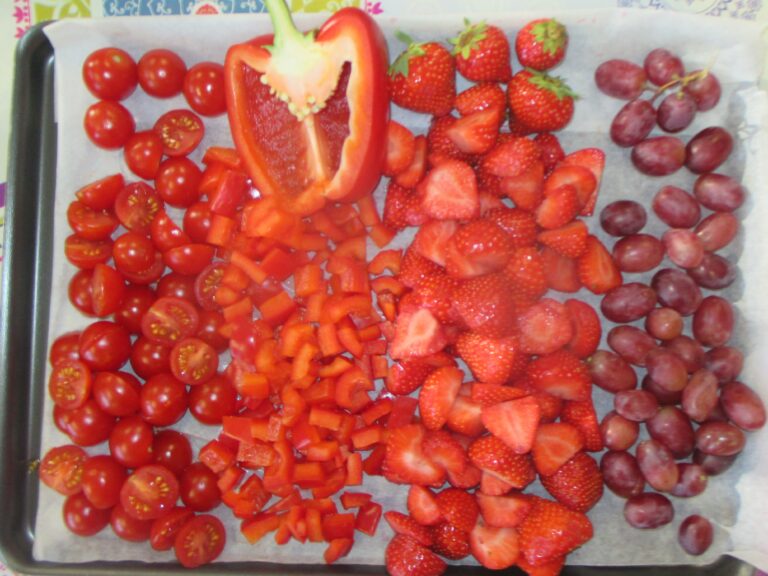 Vendredi les fruits et légumes rouge étaient de sortie: poivrons, tomates, fraises et raisins (sans pépin). Nous avons été déroutés par le poivron que nous n’avons pas l’habitude de manger cru.