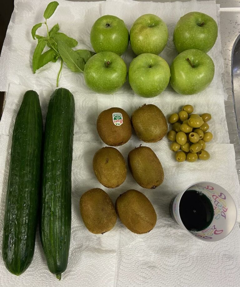 Le plateau vert contenait finalement des concombres et des olives ainsi que des kiwis et des pommes «granny». Sans surprise, les olives, plus amères, n’ont pas fait l’unanimité !