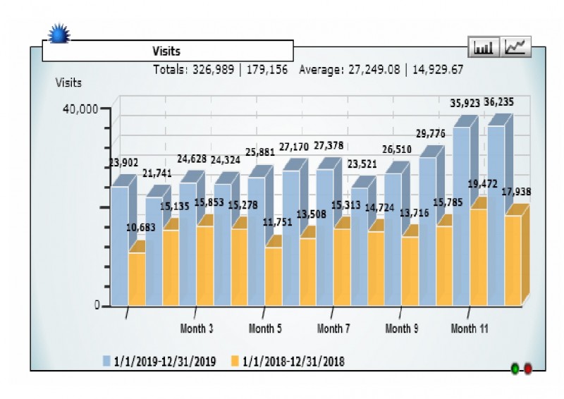 La moyenne mensuelle des connexions du site internet pour l’année 2019, est de 27 249 visites, avec en décembre un total de 36 235 visites. Lorsque l’on compare l’année 2018 à 2019, on constate une augmentation de près de la moitié des connexions. En 2018, la moyenne mensuelle était de 14 929 visites. Nous nous efforçons quotidiennement de tenir le site à jour sur l’actualité de notre commune, ces chiffres sont encourageants, merci à vous !!