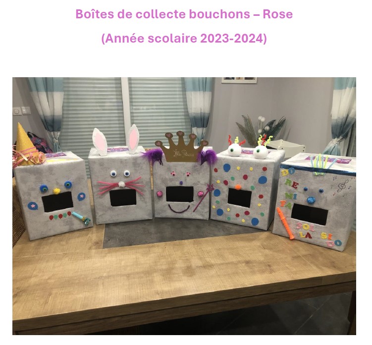 Durant plusieurs années, Mme HAMON a mis en place au « Groupe Scolaire Les Farfadets / La Salicorne », la récolte des bouchons en plastique, pour les remettre à l’association :