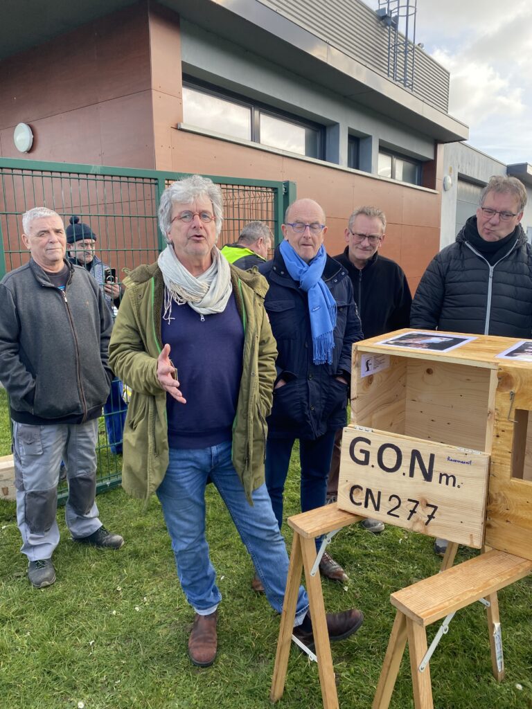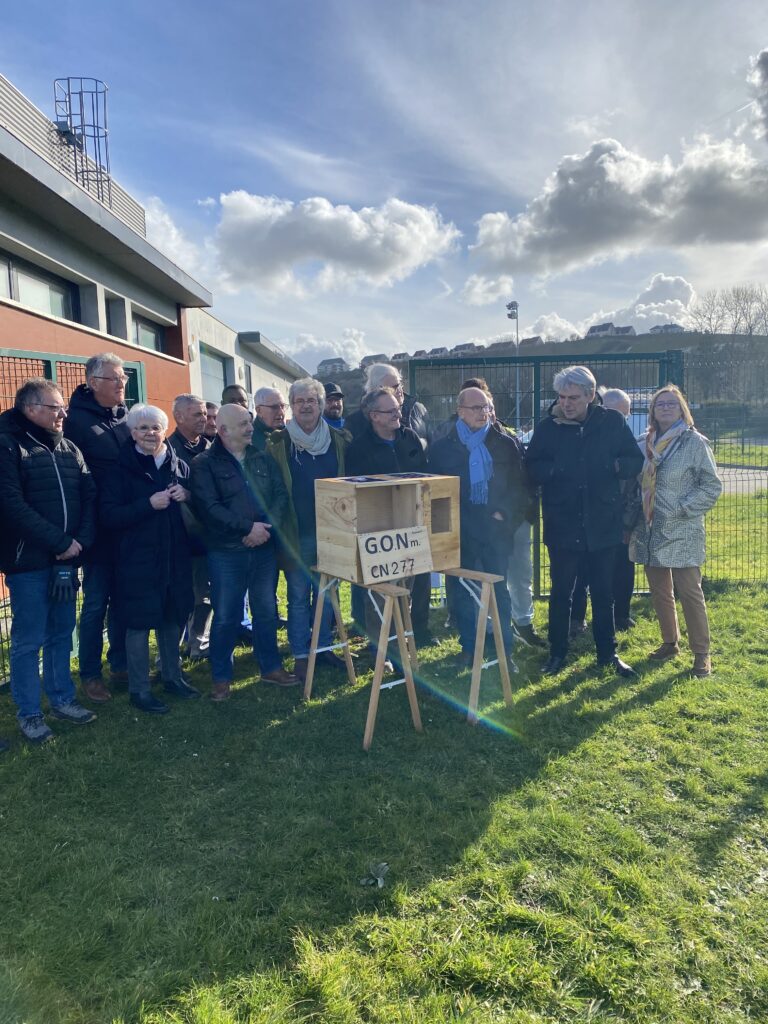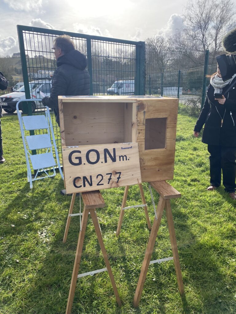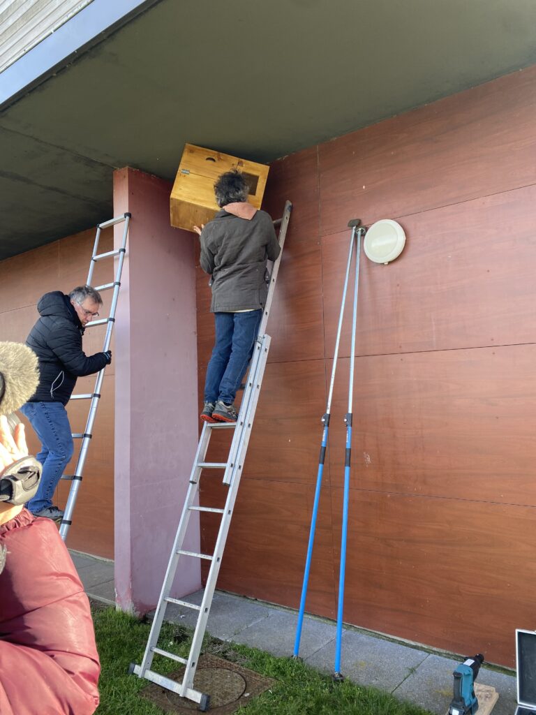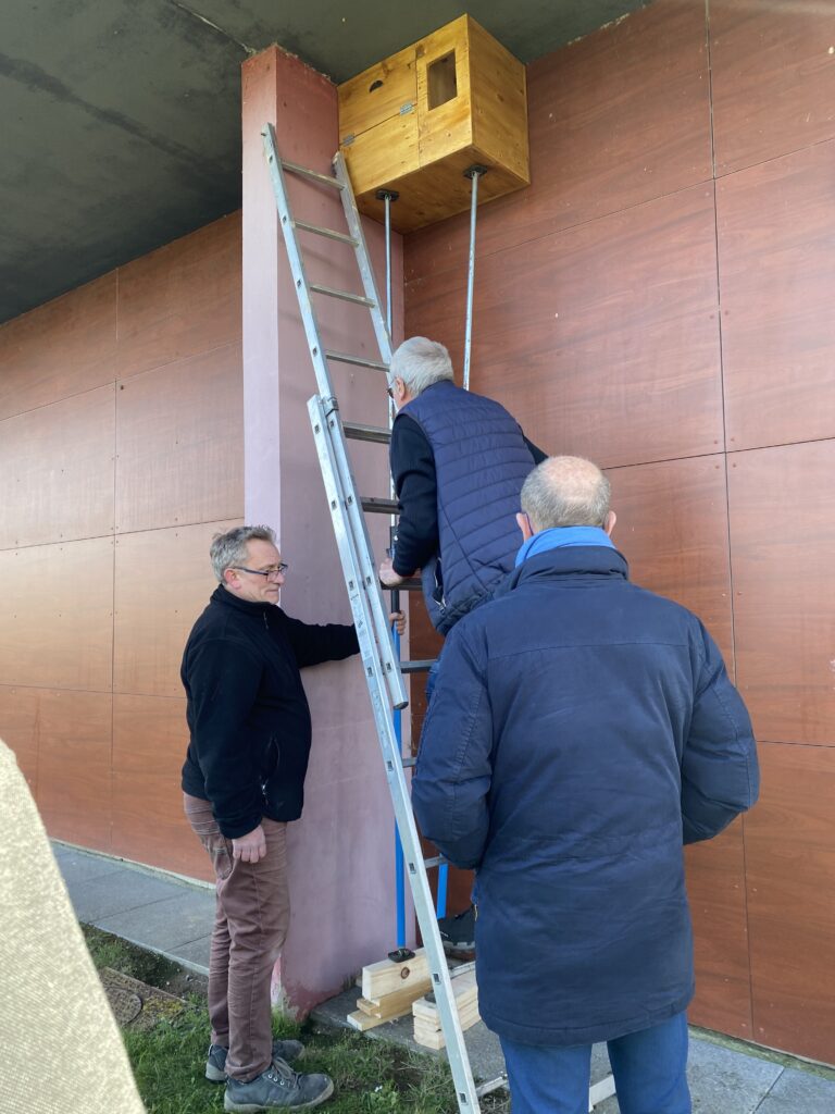 Mercredi 5 février a eu lieu l’installation de ce nichoir, de conception en bois recyclé, aux dimensions spécifiques (65 cm (L) x 44 cm (P) x 49 cm (H)), réalisé par les ATELIERS DU CŒUR de Dieppe, en concertation avec le Groupe Ornithologique Normand.
